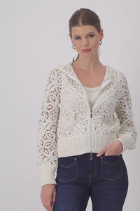 Introducing the Monari Cotton Blend Cornelly Jacket (Style 808135), a chic and versatile addition to your wardrobe. This crochet jacket is crafted from a high-quality cotton blend interwoven with glittering lurex, offering a subtle shimmer that enhances its sophisticated appeal. The Cornelly crochet pattern adds texture and elegance, while the practical 2-way zip provides functionality. Designed with a regular fit, it features a hood and long sleeves with wide ribbed cuffs, ensuring both comfort and style.